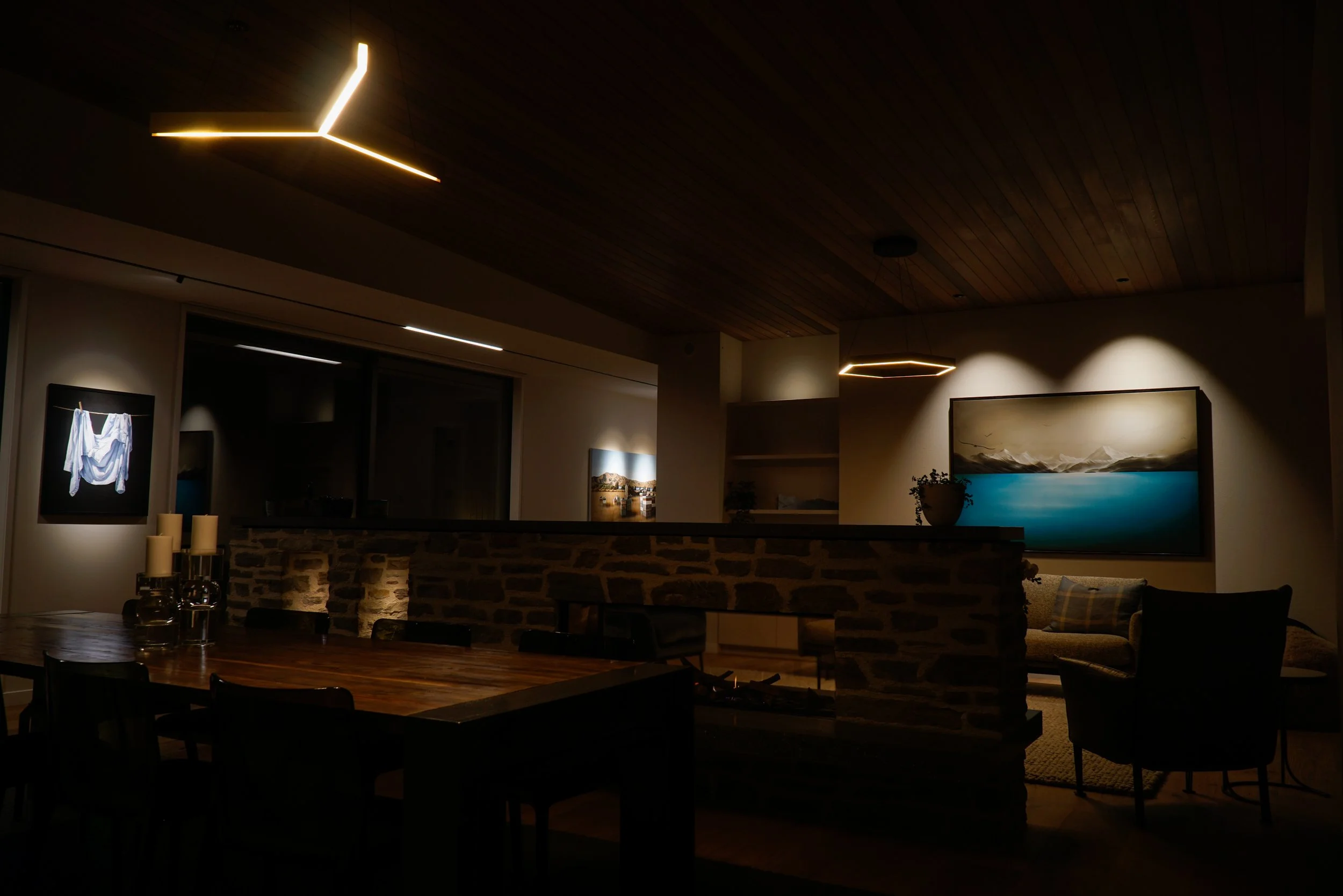 Feature pendants, recessed track lighting, art spot lighting, LED integration, and recessed hallway lighting were all thoughtfully incorporated to create a layered, cohesive result.