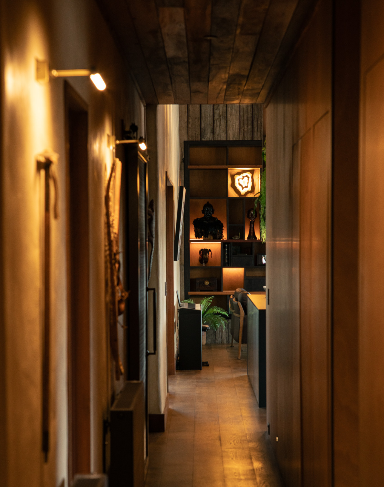 Throughout the house, carefully curated lighting enhances every space. From the living room where feature lighting accents cabinetry and recessed downlights with copper inserts illuminate the dark timber ceiling, to the dining room with its three-watt downlights and striking pendant light that casts captivating shadows. Each hallway features discreet art spots and sensor-equipped tread lights for subtle illumination, while bedrooms offer task lighting, wall-mounted features, and ambient LED strips. The main bathroom boasts sensor-driven illumination and elegant vanity mirror lights, and the master suite is lit with wall wash downlights and hidden LEDs in the ensuite. Motion-sensor lights at the entryway and vintage-style exterior lights in copper and dark steel complete the cohesive, eco-friendly lighting design.
